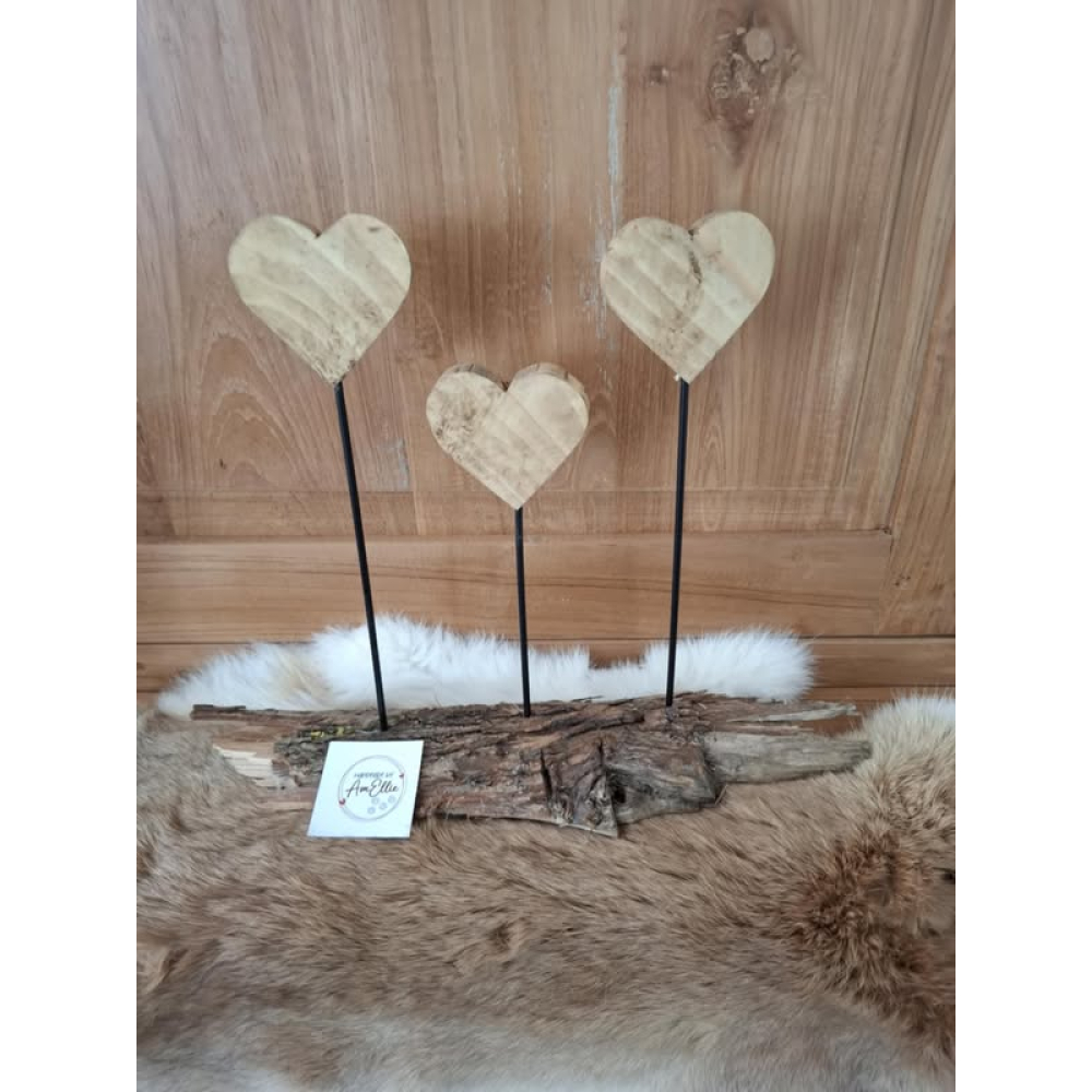 3 hartjes uit grenenhout behandeld met bijenwas op zwart metalen staafje op een basis van schors