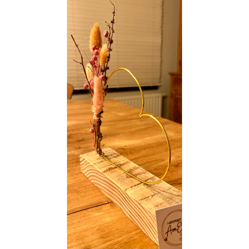 hartje in goudkleurige metaaldraad met droogbloemen (keuze in tinten) op steigerhouten plankje