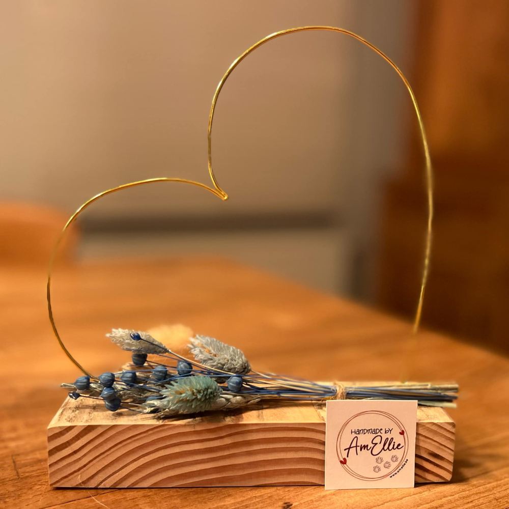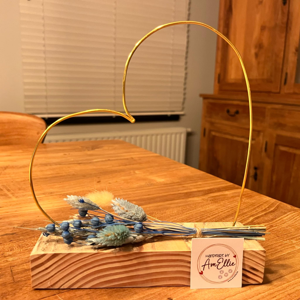 hartje in goudkleurige metaaldraad met droogbloemen in blauw- of rozetinten op steigerhouten plankje