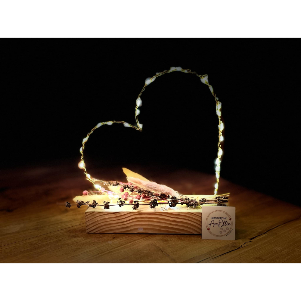 hartje in goudkleurige metaaldraad met droogbloemen (keuze in tinten) op steigerhouten plankje met led verlichting